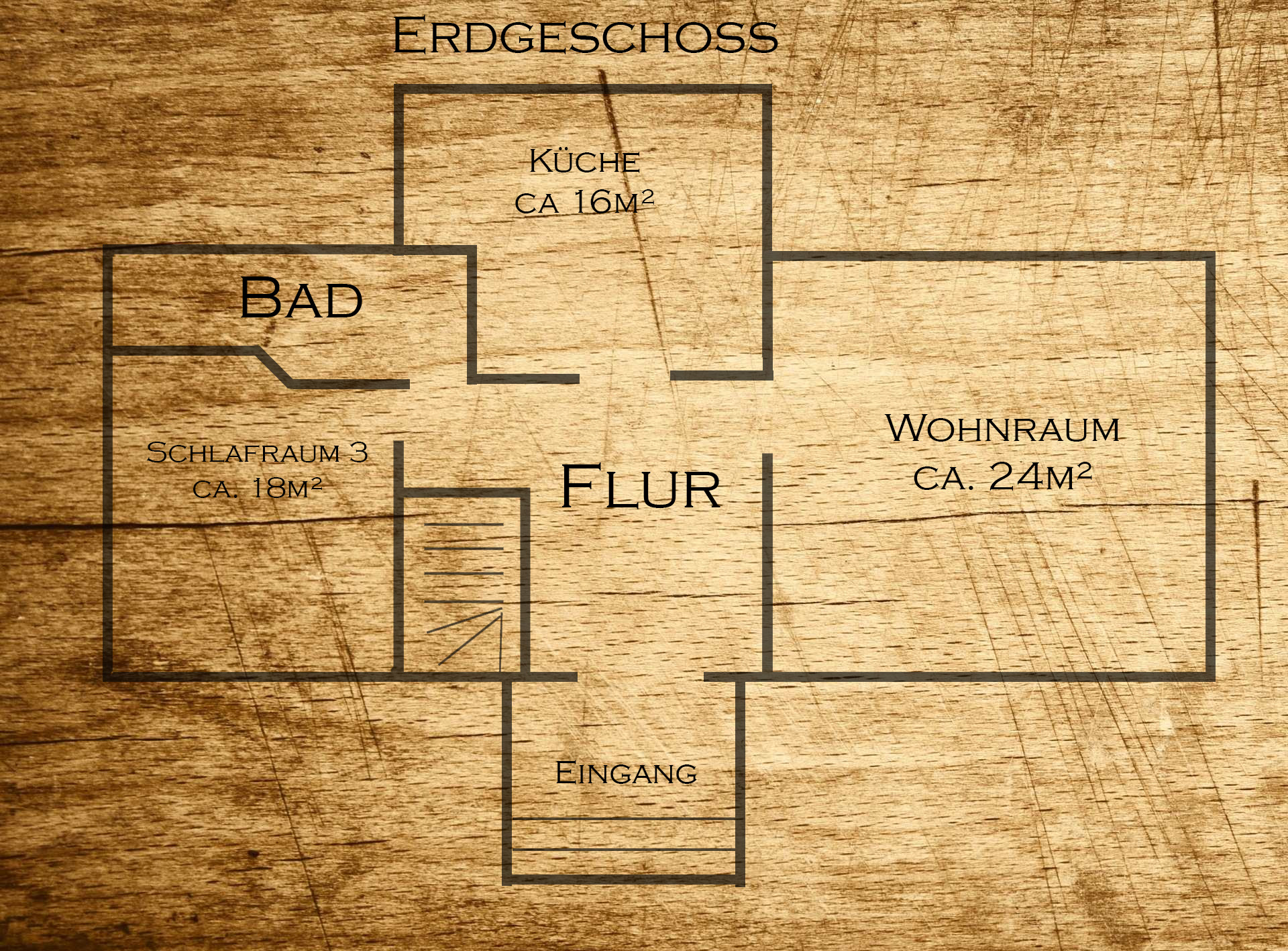 Im Erdgeschoss des Ferienhauses, befindet sich dass Badezimmer mit WC, Dusche und Badewanne, ein urig eingerichtetes Wohnzimmer mit Flachbildfernseher, die Küche mit Essecke sowie ein weiteres Schlafzimmer mit Doppelbett (Boxspringbett).